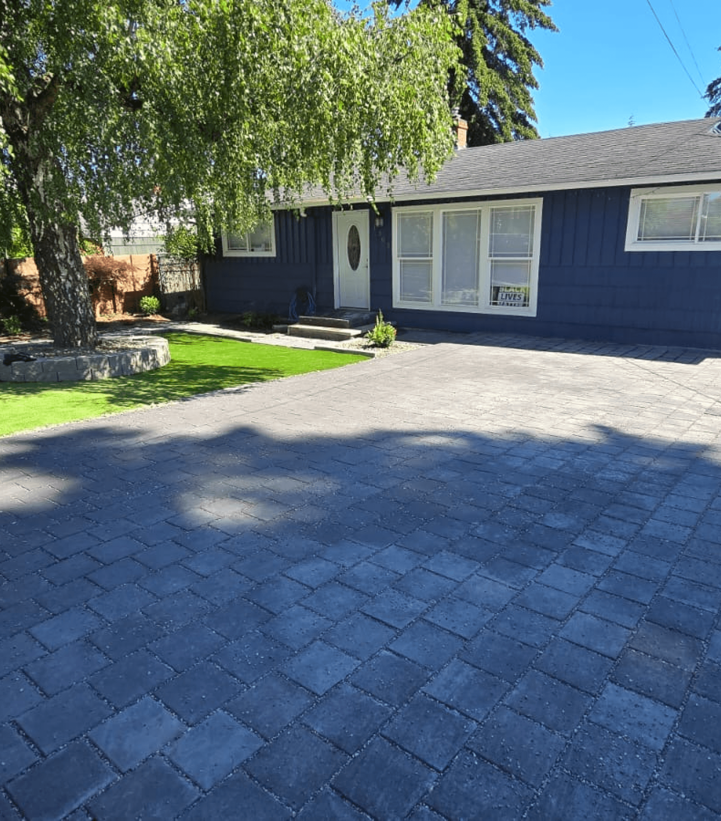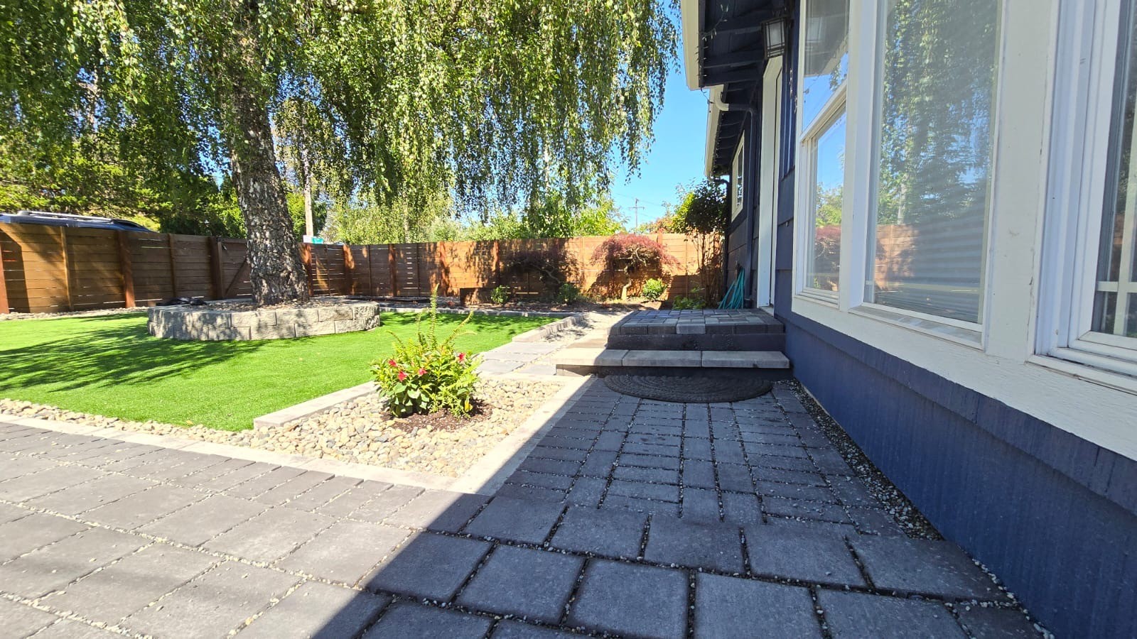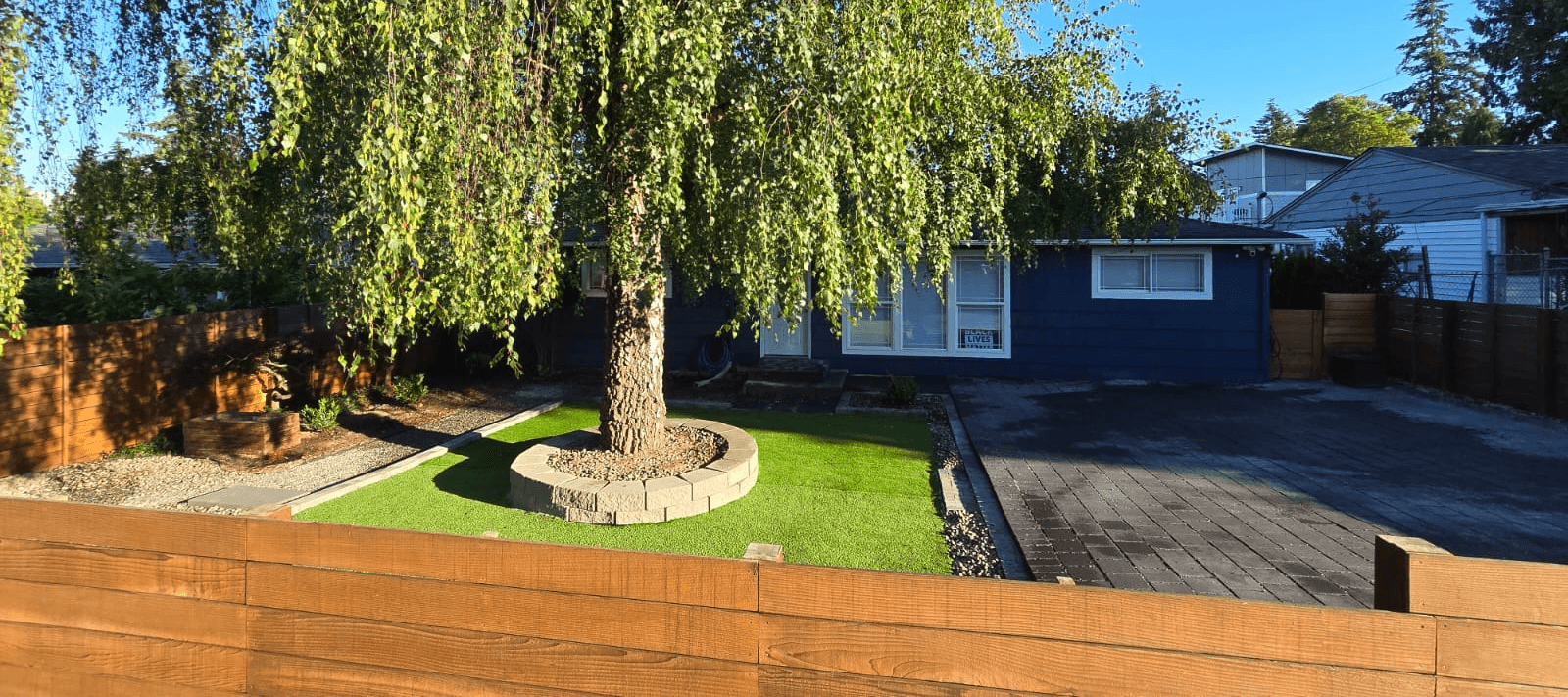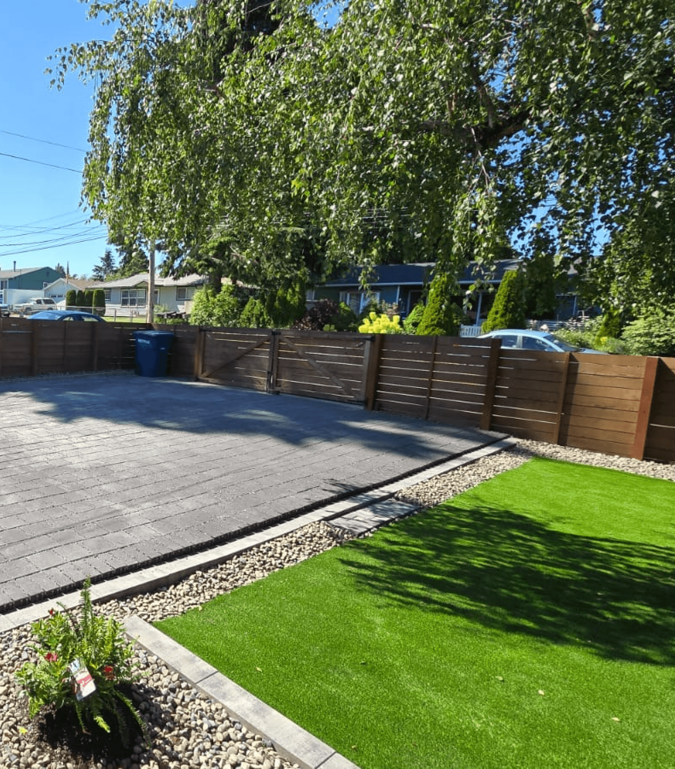 To enhance the yard's depth, we built a circular retaining wall around a tree and added a new pathway from the entry gate to the front door. Finally, we stained the entire fence with a semi-transparent cedar finish for a fresh, updated look. Upon returning from their European vacation, the owners were thrilled, exclaiming, “This looks like a completely different home!”