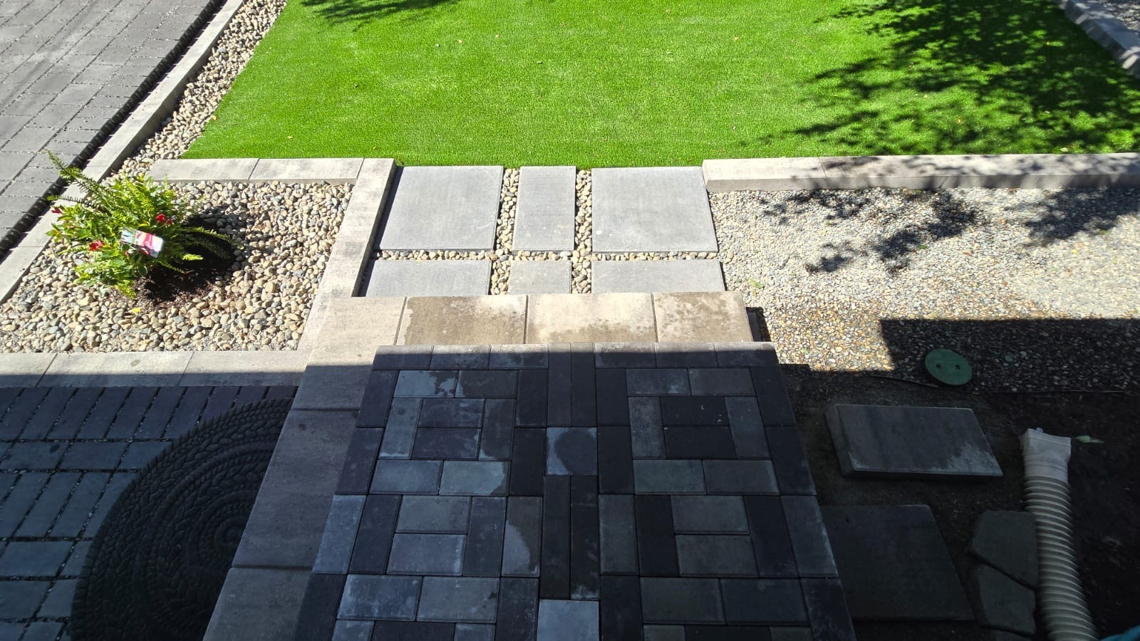 The clients wanted to completely upgrade their yard, including the driveway. We installed interlocking paver blocks for the driveway, seamlessly connecting it to the newly paved side entry to the backyard. By updating the existing concrete pad and adding new pavers, we created a welcoming walkway to the front door. Existing grass was replaced with artificial turf, and we expanded the garden to include more drought-tolerant plants, along with an art deco privacy panel.