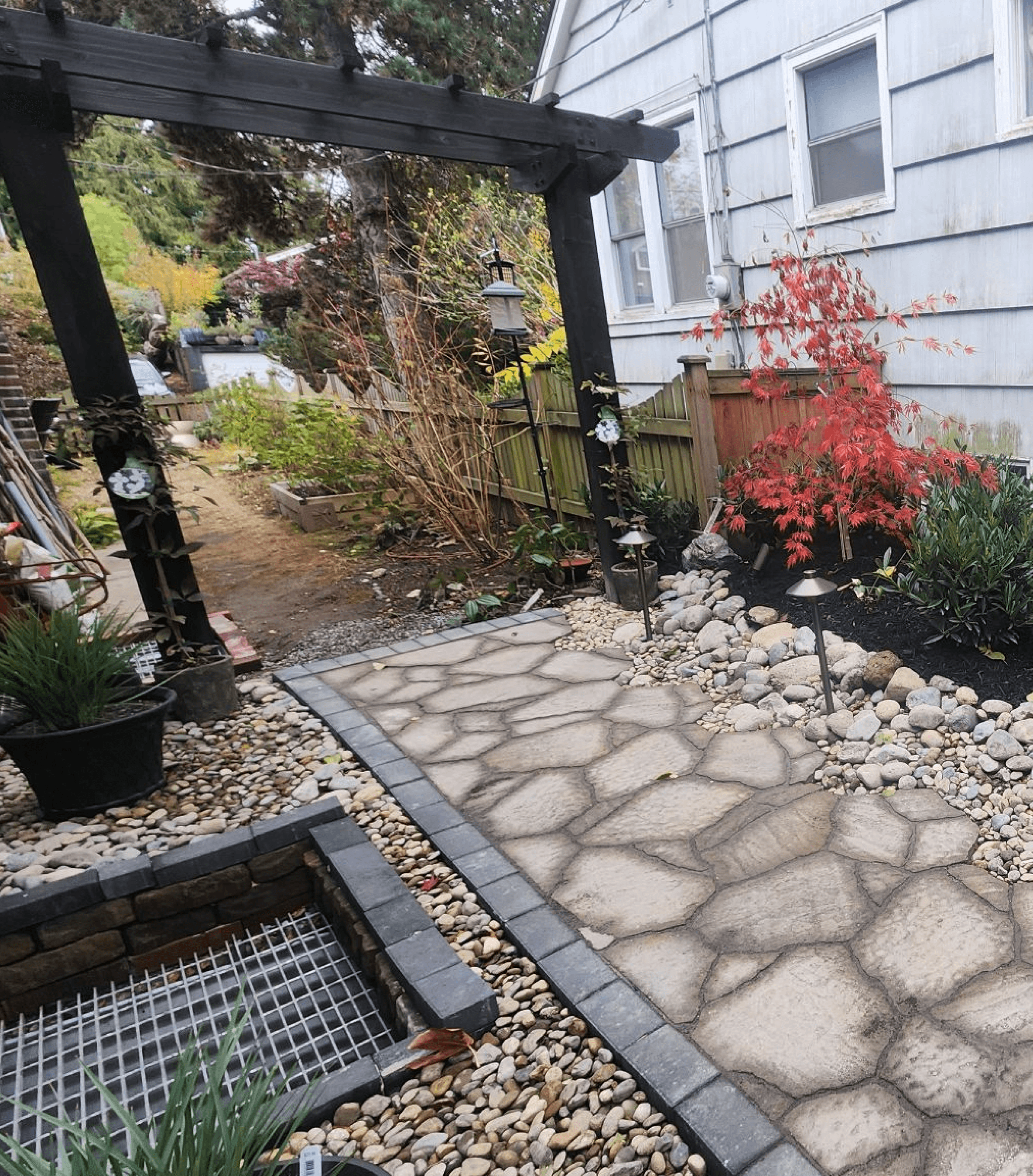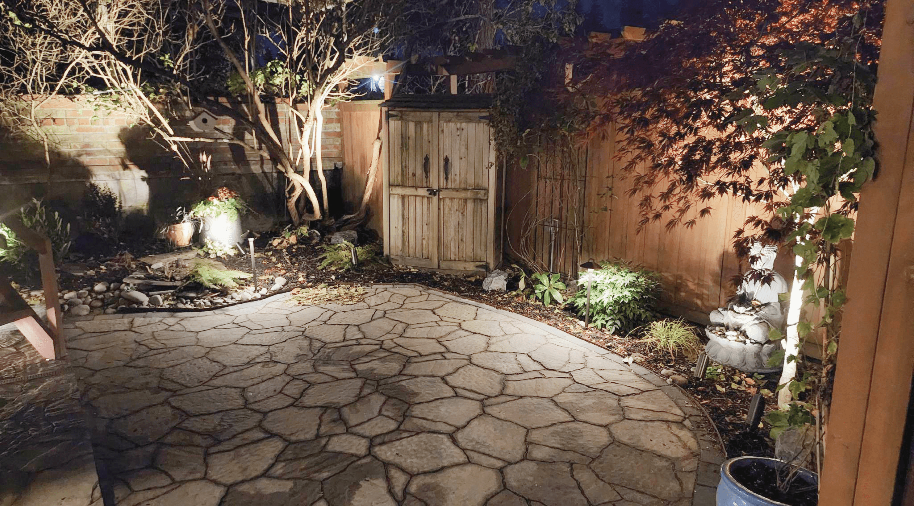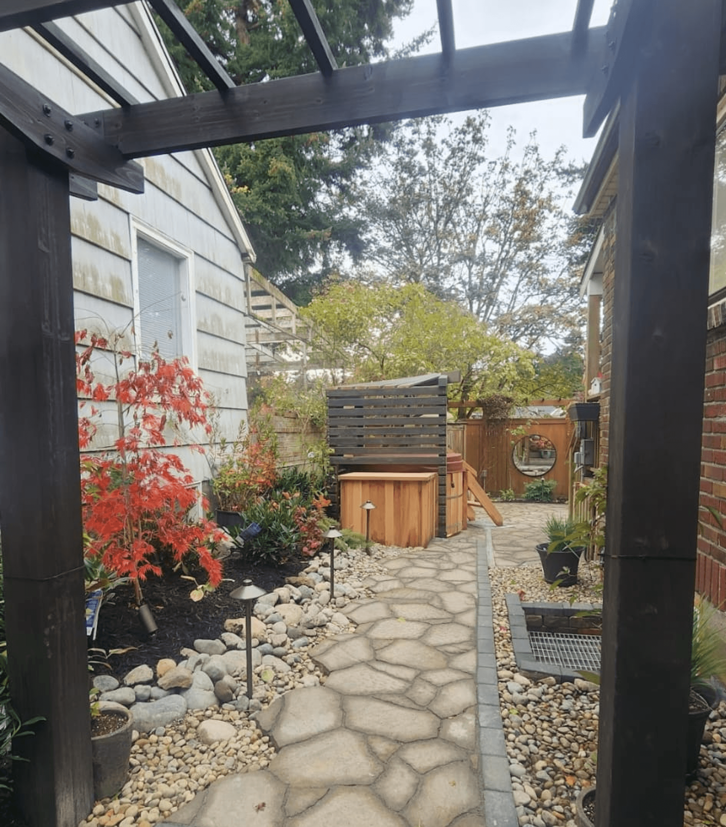 We transformed our clients' backyard into a resort-like oasis, complete with a Redwood hot tub and a cozy paver patio featuring a fire pit. Surrounded by lush plants and soft landscape lighting, the space offers a secluded and peaceful retreat just minutes from downtown. Our design captures the essence of a vacation getaway, allowing the family to unwind and enjoy their own personal paradise right at home.